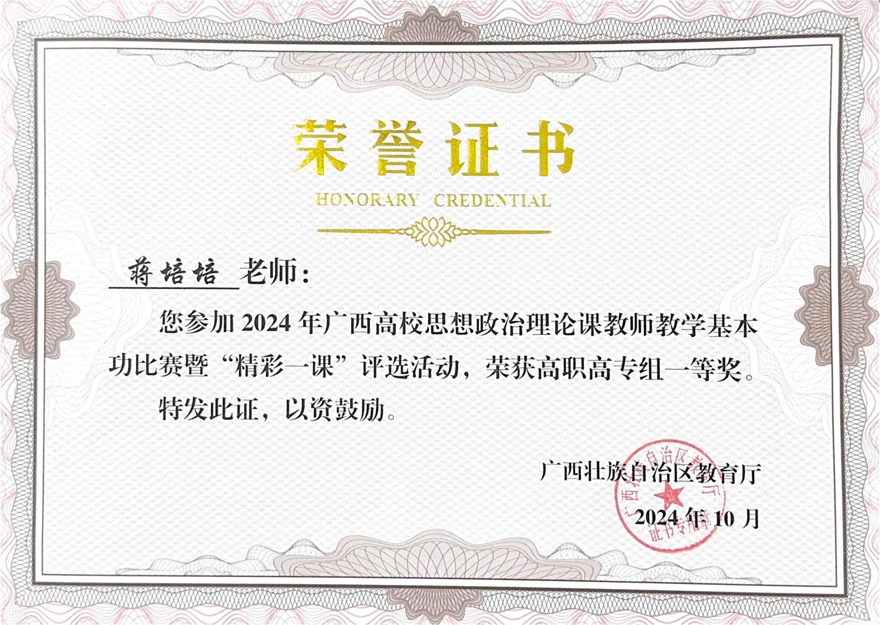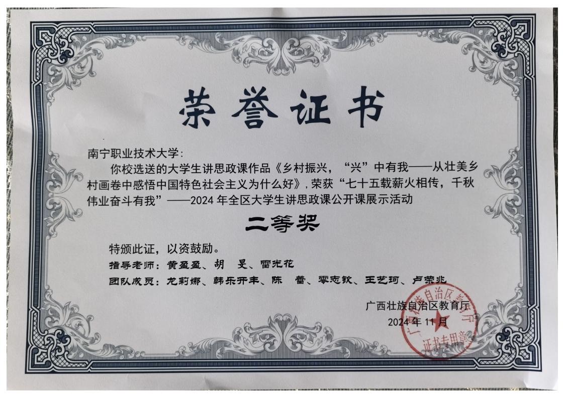 2024年全区高校老员工讲思政课公开课展示活动二等奖荣誉证书(黄盈盈、胡旻、雷光花)