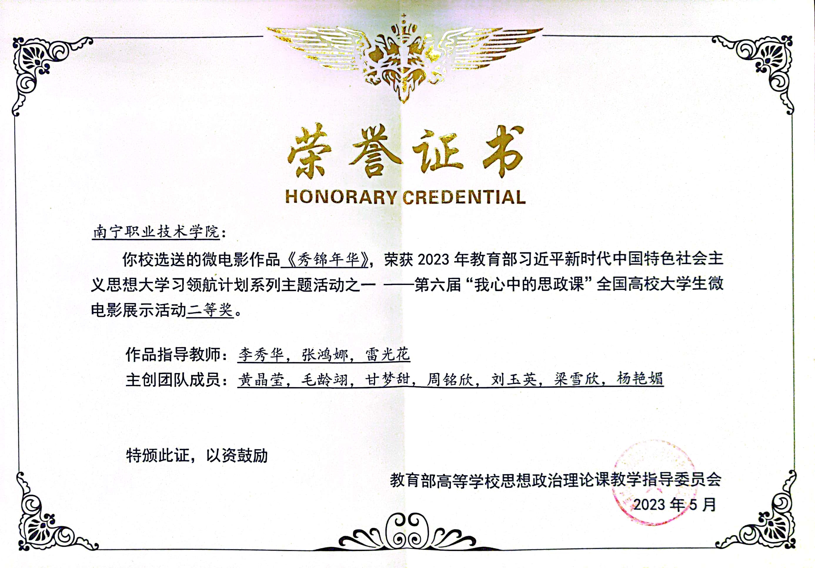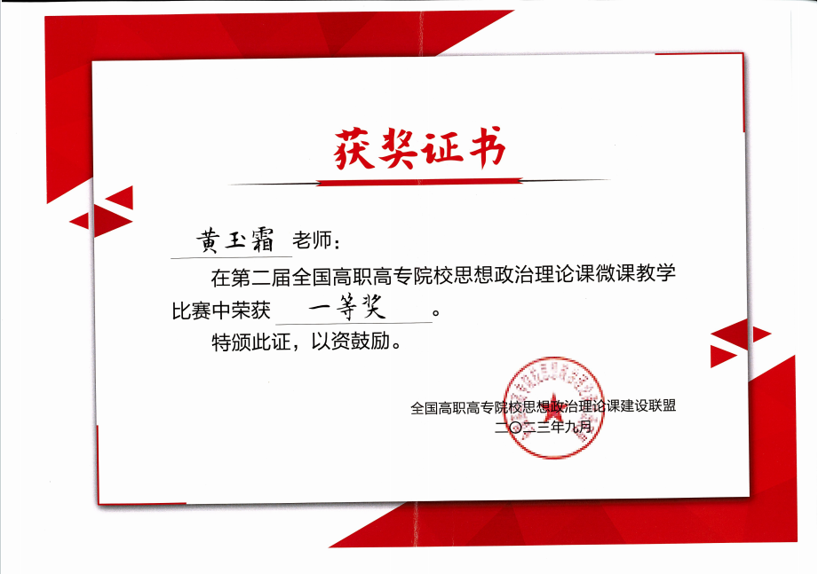 2023年黄玉霜老师荣获“第二届全国高职高专院校思政课微课教学大赛一等奖”