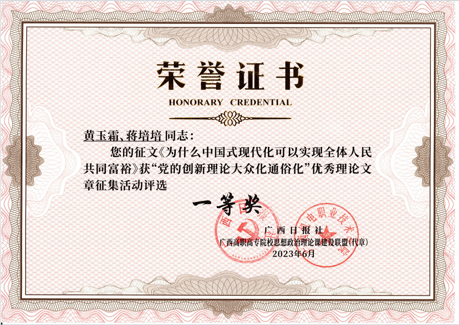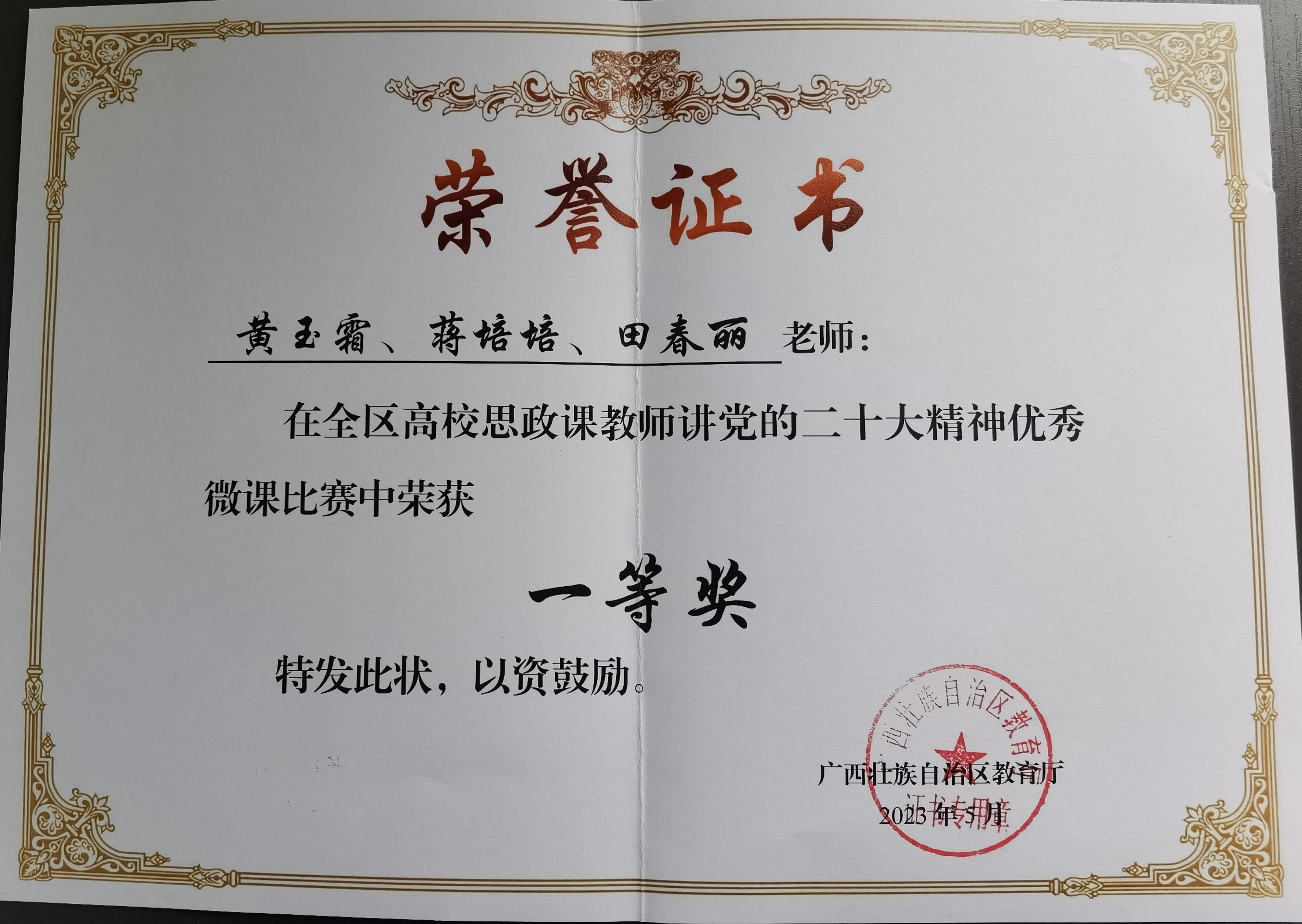 2023年黄玉霜、蒋培培、田春丽老师在全区高校思政课教师讲党的二十大精神优秀微课比赛中荣获一等奖