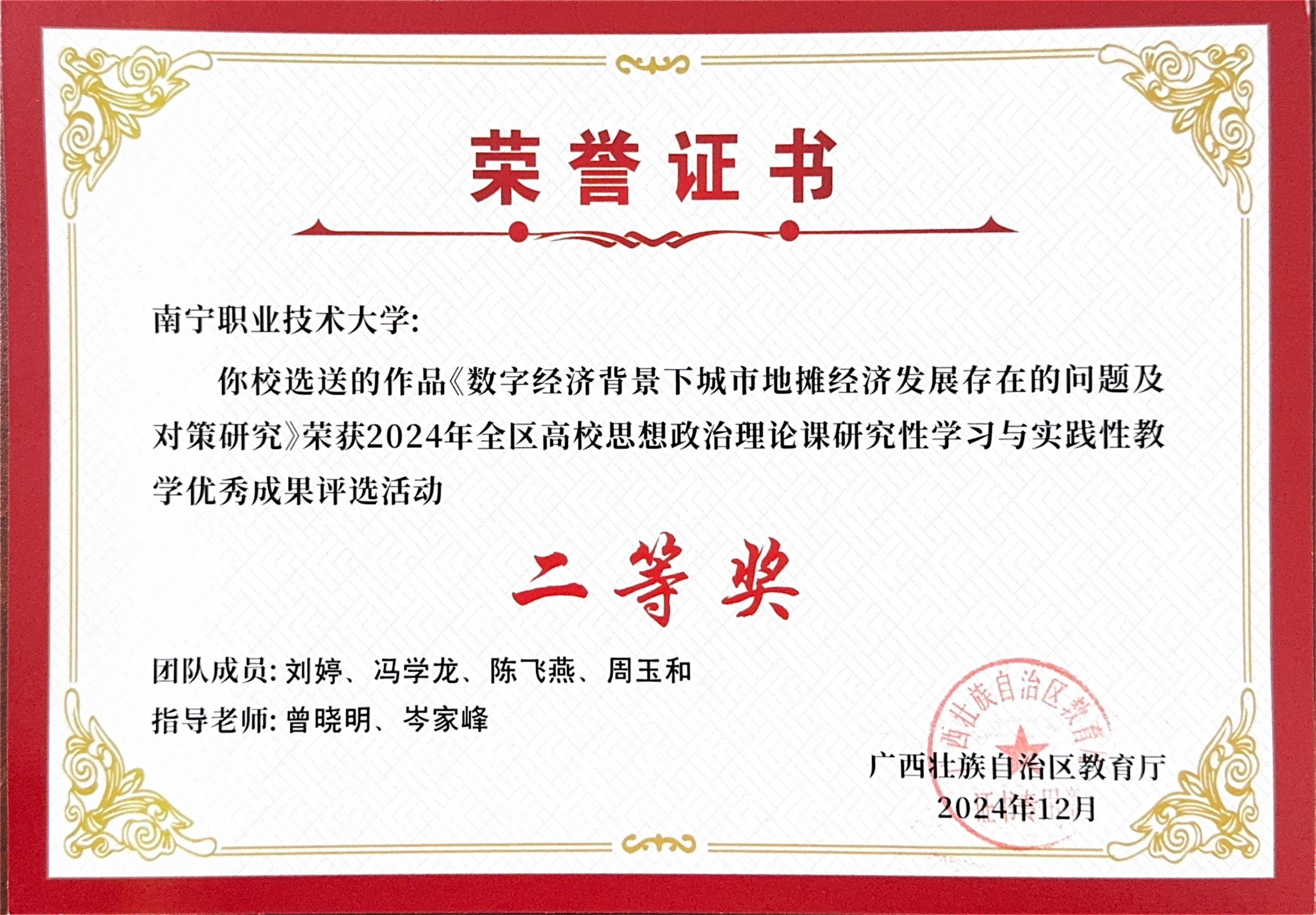 2024年全区高校思想政治理论课研究性学习与实践性教学优秀成果评选活动二等奖荣誉证书(曾晓明、岑家峰)