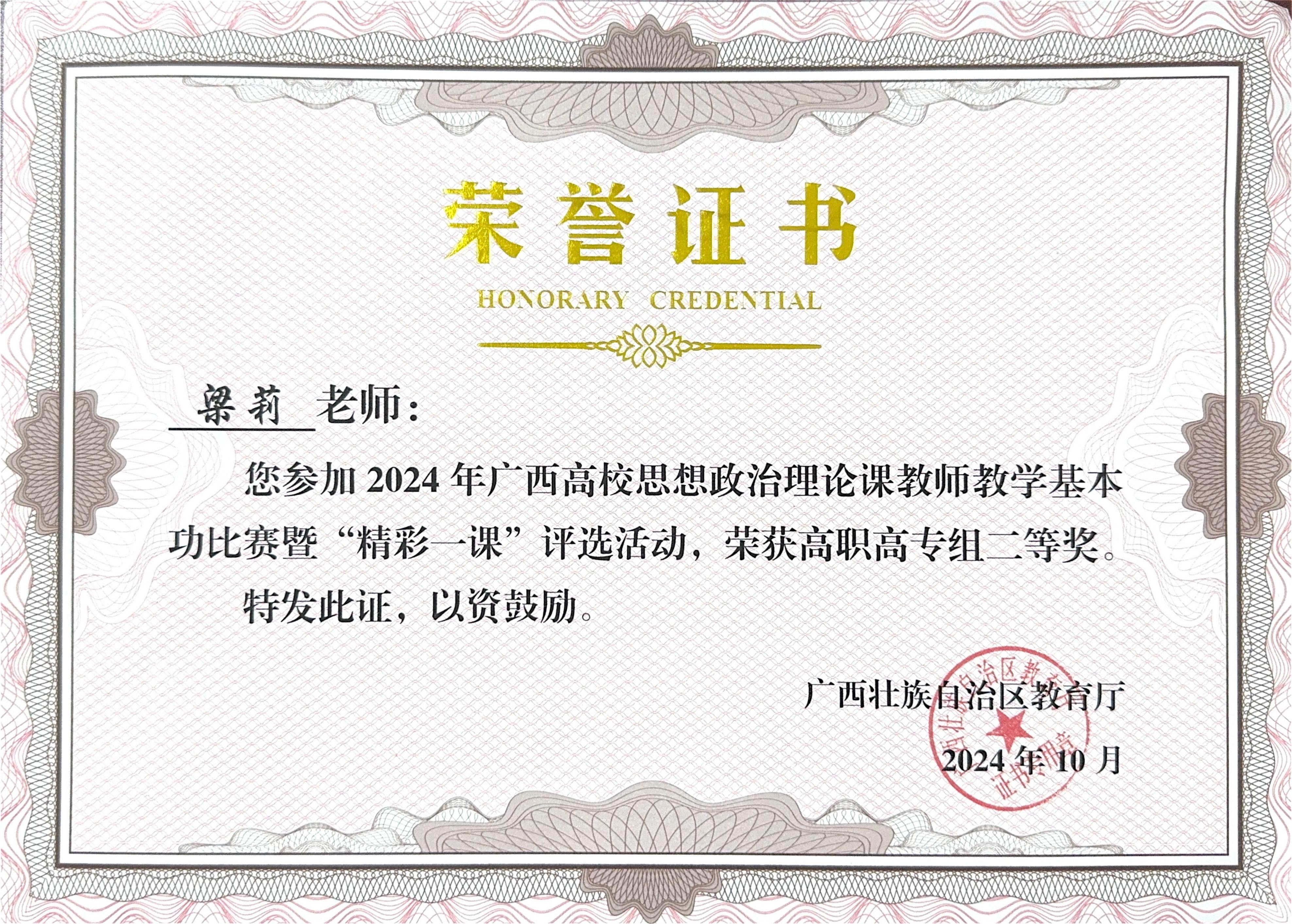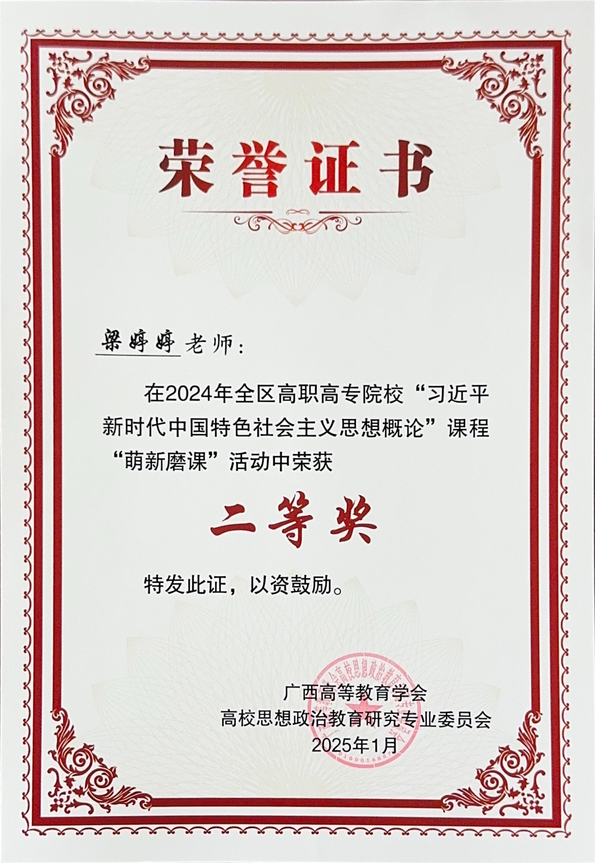 2024年全区高职高专院校“习近平新时代中国特色社会主义思想概论”课程“萌新磨课”活动二等奖荣誉证书(梁婷婷)