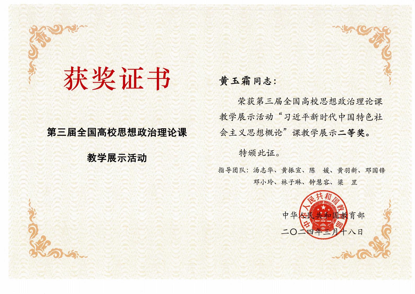 2024年3月 第三届全国高校思政课展示获奖证书(黄玉霜)
