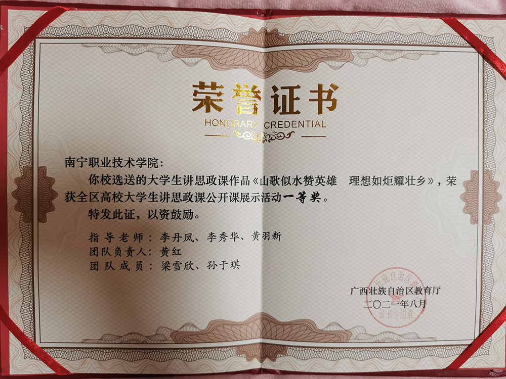 2021年8月李丹凤、李秀华、黄羽新指导的老员工讲思政课作品《山歌似水赞英雄-理想如炬耀壮乡》获全区高校老员工讲思政课公开课展示活动一等奖