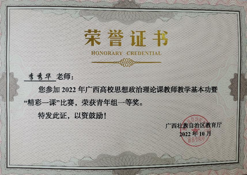 2022年李秀华老师荣获“ 精彩一课”比赛青年组一等奖
