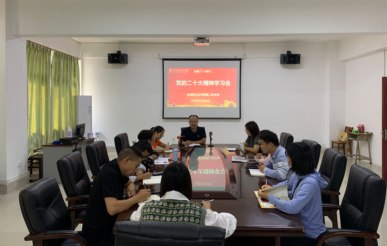 支部书记韦汉吉首先领学党的二十大报告、习近平总书记参加广西代表团讲话及党章修订等文件精神。与会党员从不同角度交流了学习体会,并就如何将党的二十大精神融入思政课教学展开充分讨论,积极发表意见和建议。