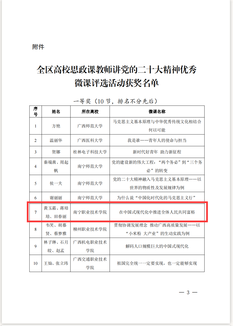 日前,自治区教育厅公布全区高校思政课教师讲党的二十大精神优秀微课比赛获奖名单,公司思政课教师黄玉霜、蒋培培、田春丽共同完成的微课作品《在中国式现代化中推进全体人民共同富裕》荣获一等奖。