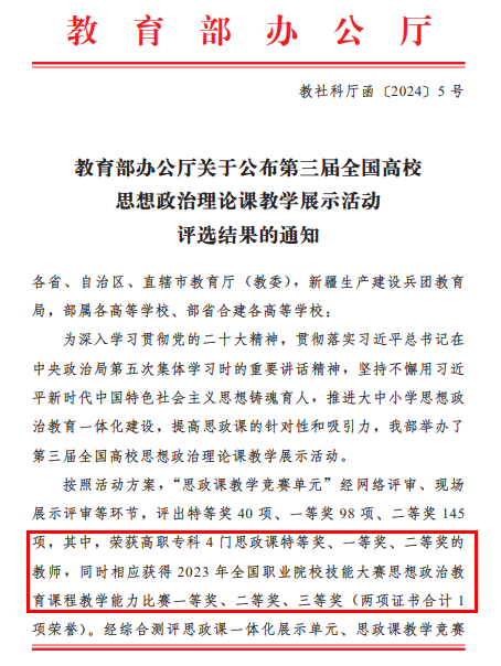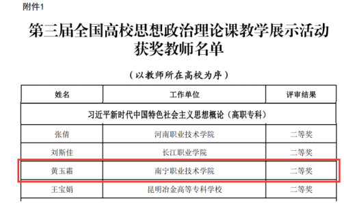 近日,教育部公布了第三届全国高校思想政治理论课教学展示活动评选结果,公司英国上市公司365教师黄玉霜荣获“习近平新时代中国特色社会主义思想概论”课程(高职高专)组二等奖,同时相应获得2023年全国职业院校技能大赛思想政治教育课程教学能力比赛三等奖,实现了公司在全国高校思想政治理论课教学展示活动中获奖的零的突破。