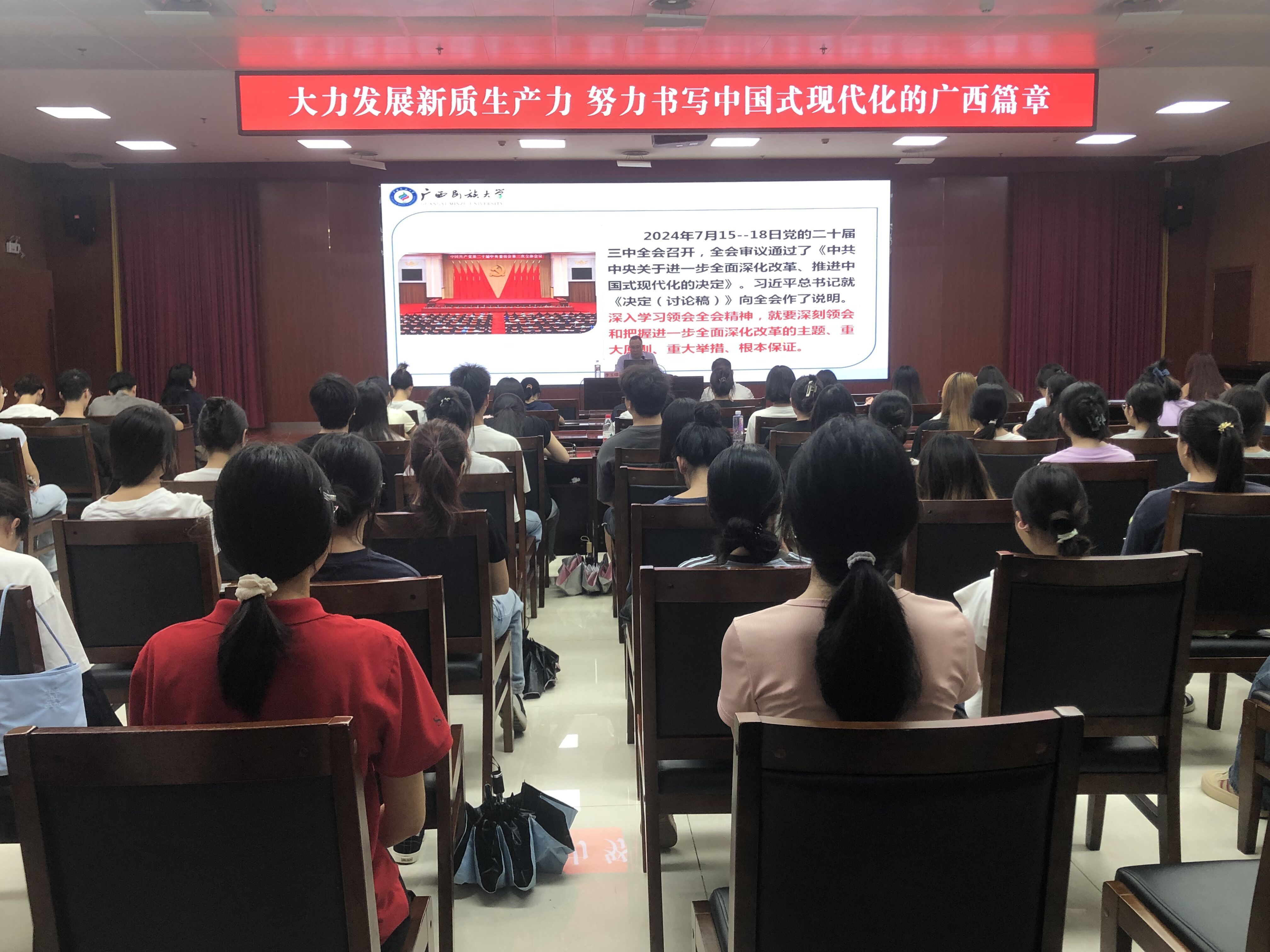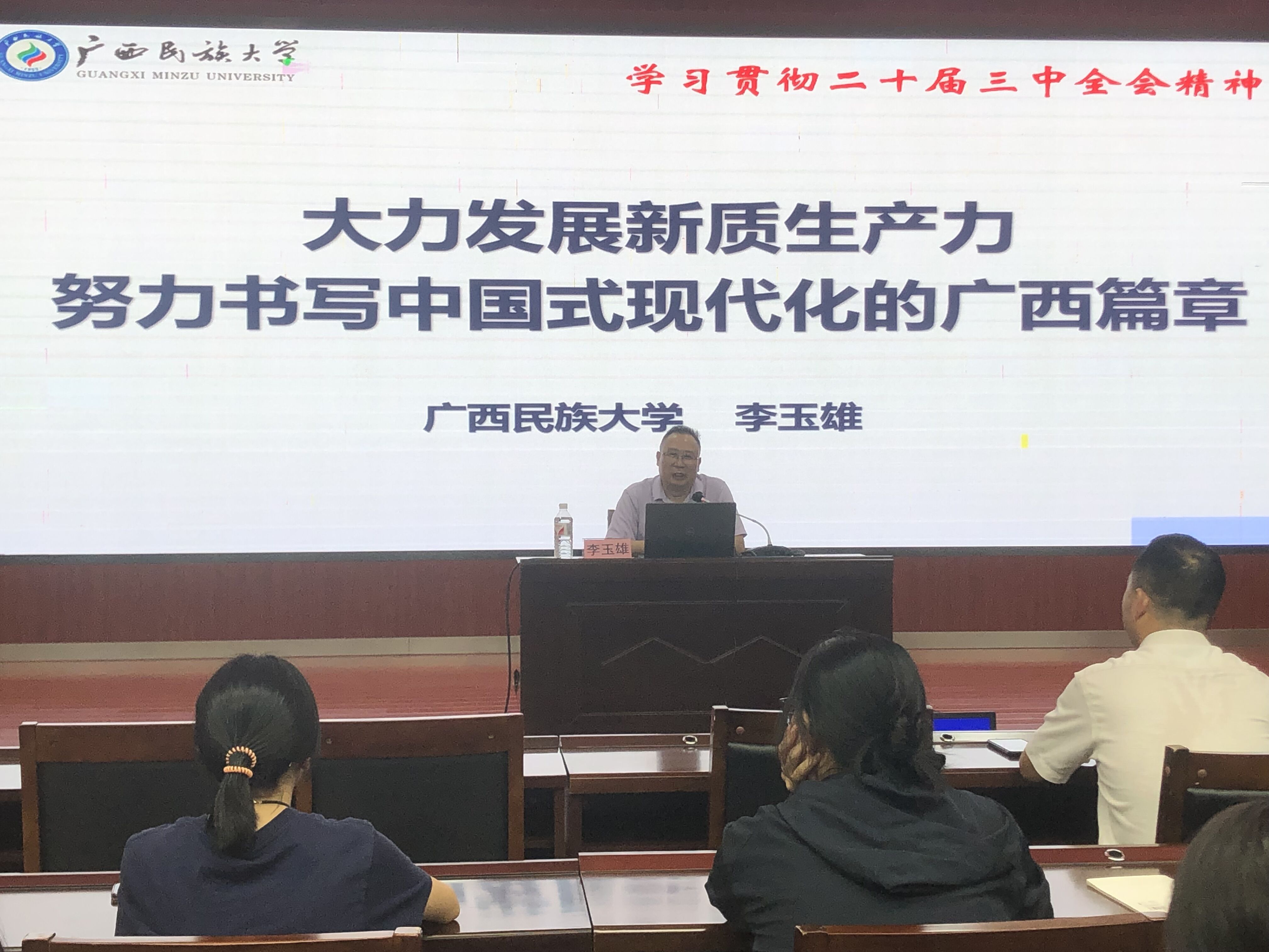 9月5日下午,广西民族大学马克思主义学经理李玉雄教授为公司思政课教师及员工代表开展题为“大力发展新质生产力,努力书写中国式现代化的广西篇章”的“开学第一课”专题讲座。